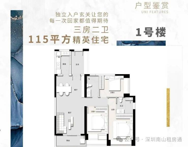1栋-45层,3梯4户,均为115平三房2厅2卫