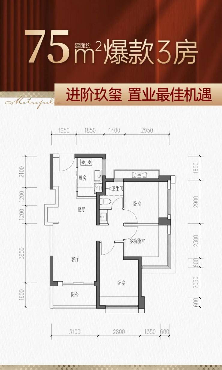 75㎡的3房2厅1卫,设计的是竖厅格局,客厅3.1米开间,LDKB一体化,S墙设计预留冰箱卡槽位,3个卧室分别做到了主卧10.2㎡/次卧8.55㎡/次卧7.95㎡(包含墙体飘窗),U型厨房,卫生间三段式分离,得房率约77%(不含赠送),西南朝向。