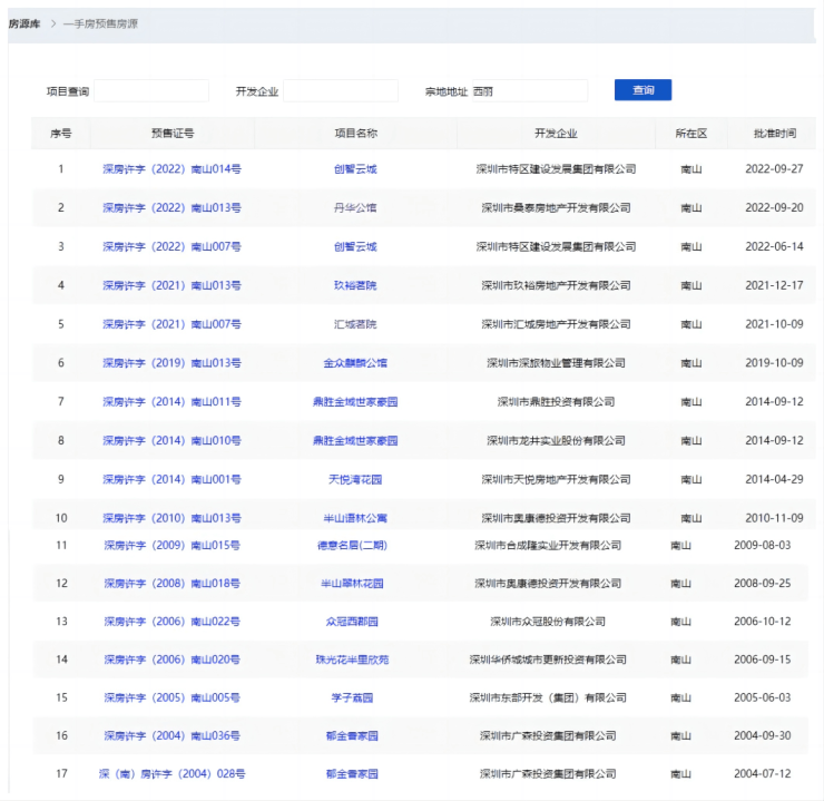 从房地产信息网官方数据中可以看到,西丽最早拿预售证的项目是2004年,至2022年,已登记拿证真正的商品房项目非常少。