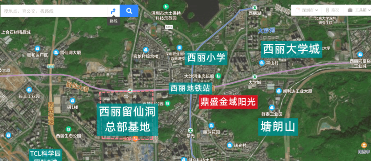 项目西侧为西丽留仙洞总部基地,东北侧为大学城,东侧为塘朗山,西南侧是西丽高铁站。
