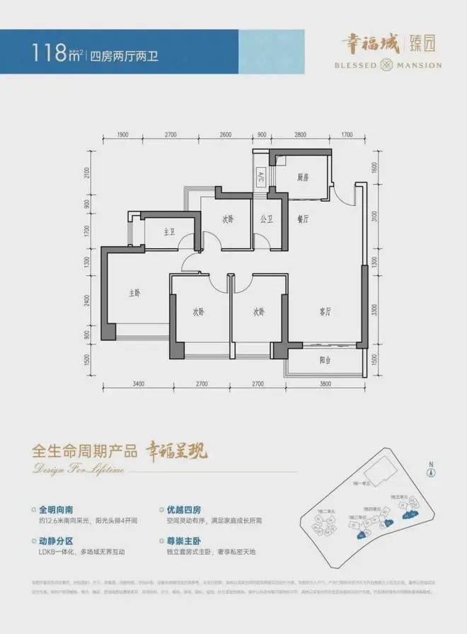 设计的是横厅南北通透格局,进门入户玄关,客餐厅6.3米开间,LDKB一体化设计,全屋8个飘窗面,4个卧室分别做到了主卧15.35㎡/次卧9.86㎡/次卧9.4㎡/次卧8.16㎡(包含墙体飘窗),U型厨房,卫生间干湿分离,得房率约84.87-87.1%(包含赠送),阳台主朝西南或东南向。