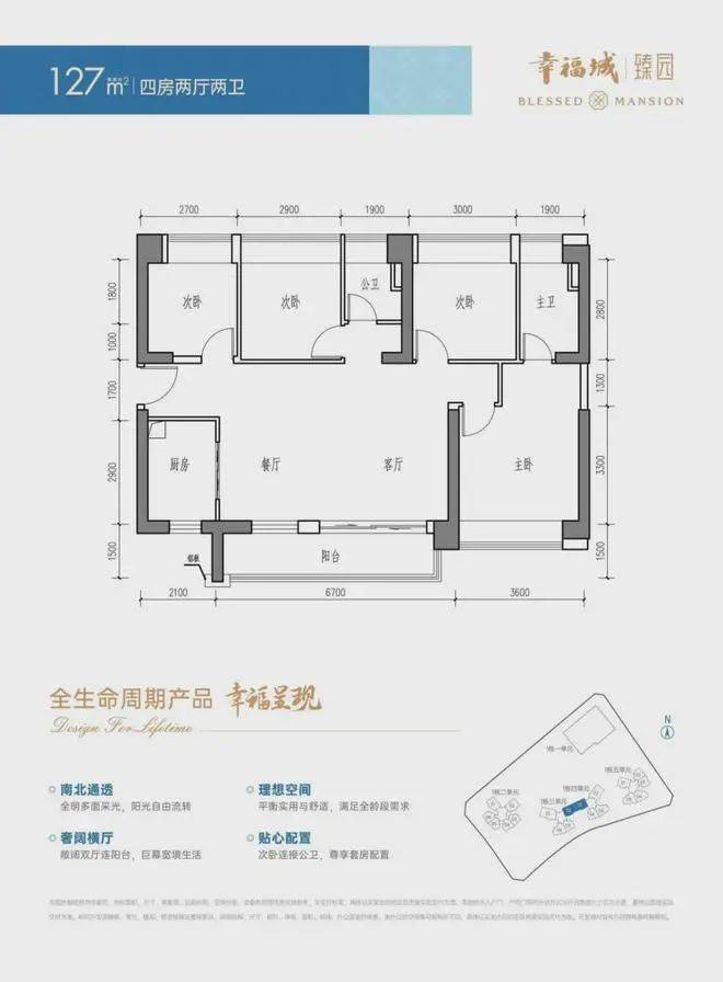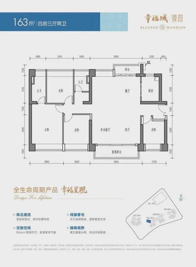 设计的是横厅南北通透格局,进门入户玄关,客厅5.9米开间,餐厨一体化设计,南北双阳台,全屋7个飘窗面,4个卧室分别做到了主卧20.14㎡/次卧12㎡/次卧11.47㎡/次卧10.43㎡(包含墙体飘窗),客厅出5.9米长的观景大阳台,U型厨房,公卫三段式分离,得房率约88.25%(包含赠送),阳台主朝西南向。