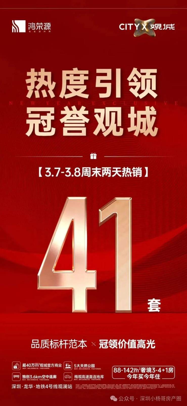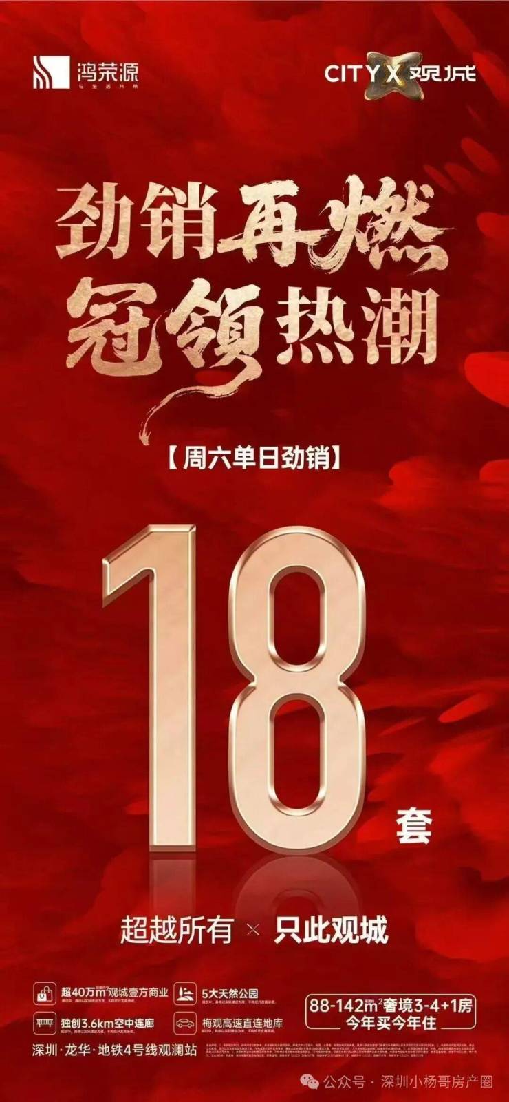年后复工,观澜的鸿荣源观城项目卖的不错,上周卖了41套,昨天单日卖了18套,小杨哥认为卖的好的其中一个点就是鸿荣源观城在前段时间名校“香港中文大学附属观城学校”落地。第二点楼盘目前也是准现房状态,实景呈现,增加买房人信心。第三点就是刚需三件套(学校,地铁,商业)都在家门口。