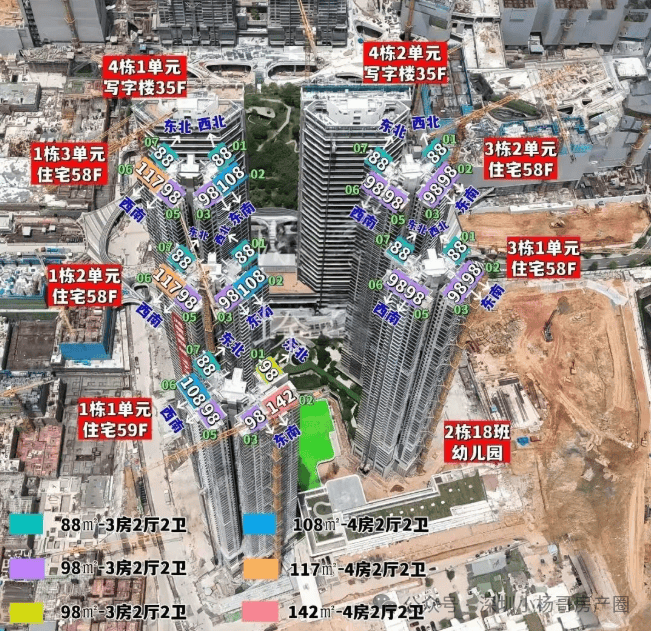 10、总栋数及楼高:由5栋58-59层高住宅组成,其中1栋1单元住宅59F,1栋2/3单元住宅58F,3栋1单元/2单元住宅58F,4栋1/2单元写字楼35F,2栋是1所18班幼儿园,配建有公交首末站。