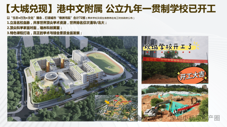项目规划5所幼儿园及3所九年一贯制学校(含72班、54班规模),其中72班制的学校是港中大附属学校,目前已经开工。明年竣工,最具有国际化的一所学校!根据2025年龙华区学区划分,小学对口观澜中心学校(省一级),初中为观澜二中或龙华第三外国语学校。