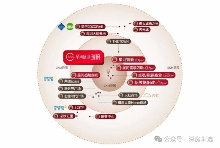 🏛约5公里范围:尽揽百万㎡商圈,星河COCOPark(龙岗山姆会员店)、大运天地、恒大城市之光、天光城等知名商业体环伺,畅享都市繁华便利。