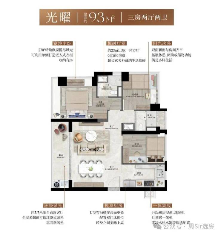 l同等户型更开阔采光:全户型多飘窗与宽阔阳台形成环绕式采光;全户型主卧双面飘窗采光,保留270°景观面。