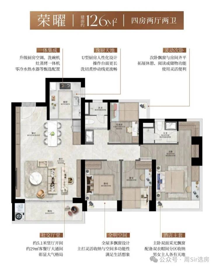 l同等户型更到位的功能实用性:全户型U型厨房布局,操作台面更长;双面齐平飘窗可打造嵌入式衣柜或休闲角,空间拓展性强。