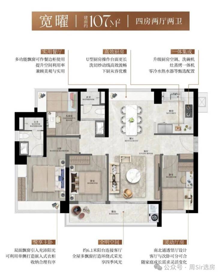 l同等户型更舒适尺度:约93方横向三房约5.7米阳台直连客厅,舒适尺度达四房级别;约103-107方四房双跨宽景阳台,开阔尺度龙华稀缺。