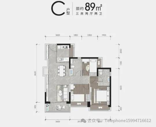 89㎡户型:传统的竖厅设计,动静分区明确,三房两厅一厨两卫一阳台的布局合理,虽然无明显亮点,但也没有明显的缺点。