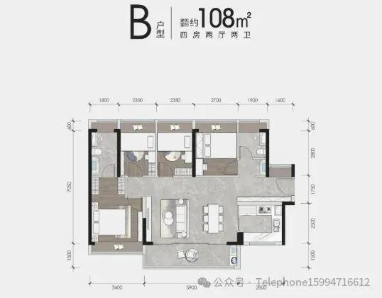 108㎡户型:横厅设计,使得客厅显得更宽,通透性更好,四房两厅一厨两卫一阳台的布局,适合家庭居住。