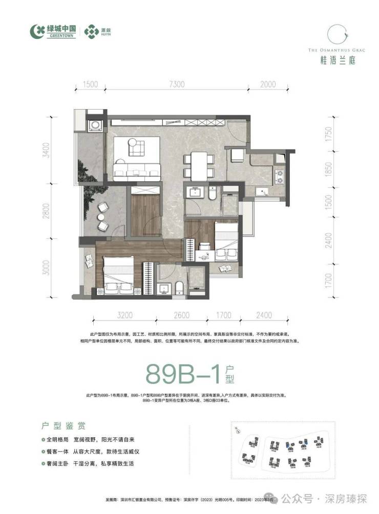 89㎡的3房2厅2卫(二期C-1户型),设计的是经典竖厅格局,客厅3.4米开间约12.92平,LDKB一体化,动静分区,分别做到了主卧12.3㎡/次卧10.36㎡/次卧7.68㎡(包含墙体飘窗),U型厨房,卫生间干湿分离,得房率:72.97%(不含赠送),阳台约5.26平西北或东南朝向。套内面积64.7㎡+赠送面积8.79㎡=实用面积73.49㎡,加上赠送后得房率约82.87%。