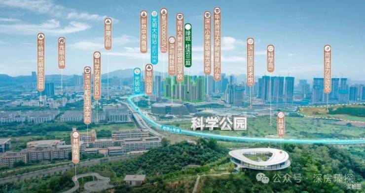绿城桂语兰庭,位于深圳市光明区光明街道核心地段,紧邻光明科学城规划区,地处光明中心区核心区域。项目距离科学公园仅约400米,步行8分钟即可抵达北翼已开放区域,享有"一核两翼"的生态景观布局,包括科学顶环廊、林梢栈道、声浪剧场等特色设施。光明科学城作为"世界一流科学城"和"综合性国家科学中心核心承载区",规划面积99平方公里,聚焦信息、生命、新材料三大主攻领域,形成"一心两区"的空间格局。