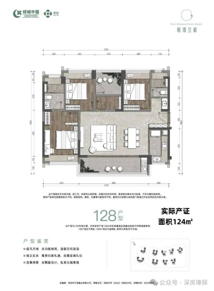 光明中心区,绿城桂语兰庭1期于2023年3月8日首推入市,本次推出3栋A/B/C/D/E座,面积有89㎡的3房2厅2卫,115-128㎡的4房2厅2卫户型,共942套房源,备案均价5万/㎡,备案单价4.07-5.93万/㎡,总价363-738万/套,当时开盘是备案价销售,现房带精装交房。
