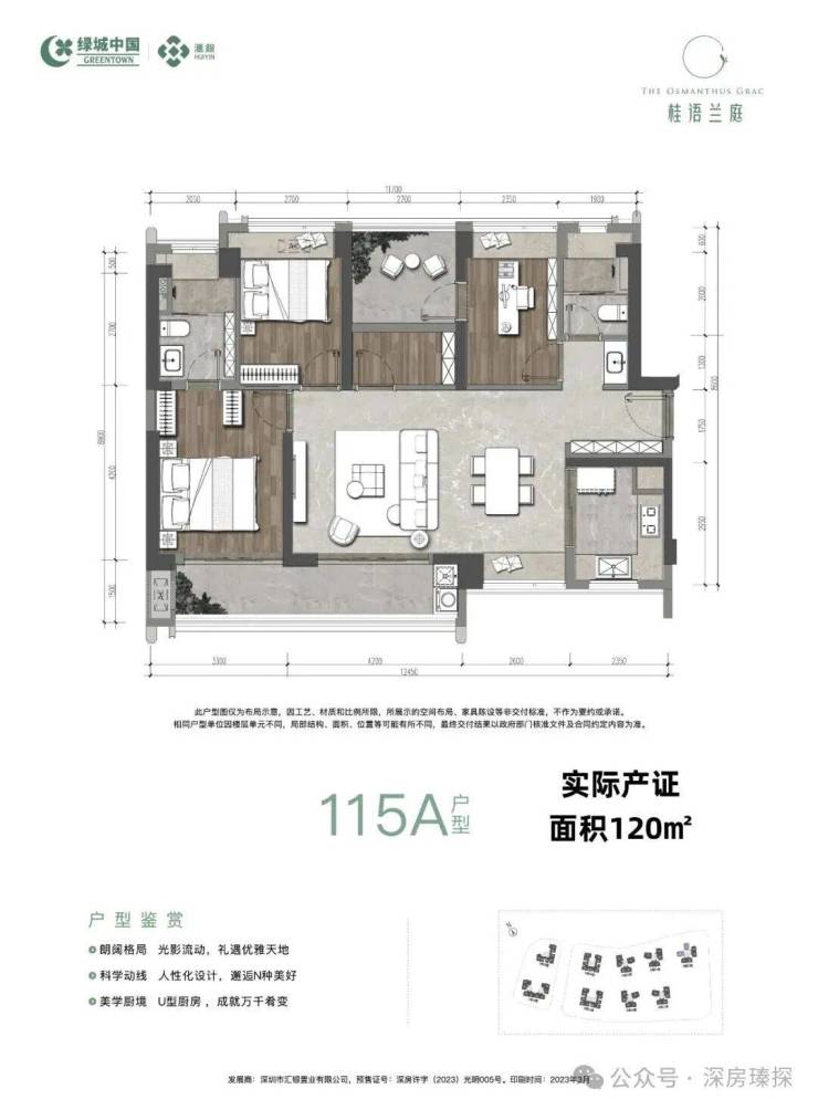 124㎡的4房2厅2卫(一期),3栋A/D座05户型,设计的是横厅南北通透格局,客餐厅6.8米开间约30.6平,LDKB一体化,分别做到了主卧17.85㎡/次卧11.4㎡/次卧10.64㎡/次卧10.26㎡(包含墙体飘窗),U型厨房,公卫三段式分离设计,得房率:78.8%(不含赠送),阳台约11.56㎡西南朝向。套内面积97.99㎡+赠送面积16.61㎡=实用面积114.6㎡,加上赠送后得房率约92.2%。