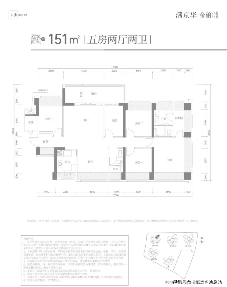 151㎡ 5室2厅2卫,南北通透横厅设计,独门独户。客厅4.5米宽,餐客厅独立。四开间朝南,卧室面积:主卧27.44㎡/次卧11.97㎡/次卧11.24㎡/次卧11㎡/次卧8.36㎡(含飘窗)。U型厨房,公卫三段式分离。得房率80.45%(不含赠送),客厅连次卧6.7米阳台,西北向观科学公园。套内121.31㎡+赠送32.09㎡=实得153.4㎡,总得房率101.73%。