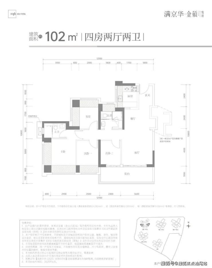 102㎡四房两厅两卫,经典竖厅,客厅3.6米宽,LDKB一体设计,预留冰箱位。动静分区,四卧室朝南(主卧15.32㎡/次卧9.5㎡/7.88㎡/6.9㎡含飘窗),客厅连观景阳台5.9米长。U型厨房,公卫三段分离。得房率80.45%(不含赠送),实得面积100.42㎡(套内81.85㎡+赠送18.57㎡),赠送后得房率98.7%。朝向西南或东南。